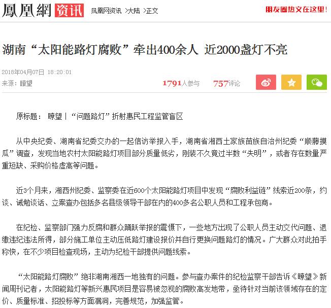 近日,一則關(guān)于“湖南農(nóng)村太陽能路燈腐敗牽出400余人 近兩千盞不亮”的報(bào)道受到了太陽能路燈行業(yè)的廣泛關(guān)注。新聞報(bào)道了該地區(qū)花垣縣補(bǔ)抽鄉(xiāng)大哨村,72盞太陽能路燈中有56盞“失明”;而龍山縣石羔街道元堡社區(qū)60盞路燈中,有近半數(shù)不亮,等一系列問題工程。如此荒唐的工程不禁讓人對(duì)其背后的原因進(jìn)行深思。