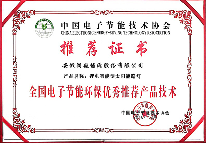 朗越能源專利產品,鋰電智能型太陽能路燈獲得“全國電子節(jié)能環(huán)保產品技術創(chuàng)新示范企業(yè)”證書,并被收錄進全國電子節(jié)能技術和產品數(shù)據(jù)庫。