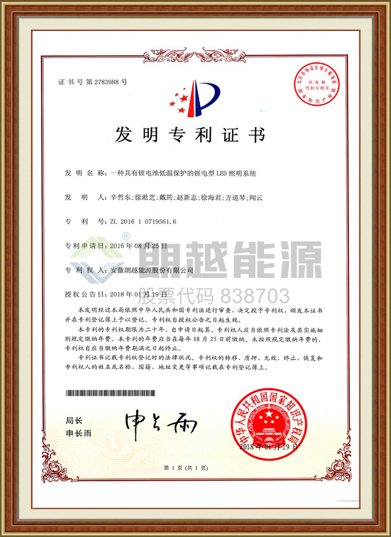 2018年1月19日,朗越能源新增發(fā)明專利(一種具有鋰電池低溫保護(hù)的鋰電型LED照明系統(tǒng))。