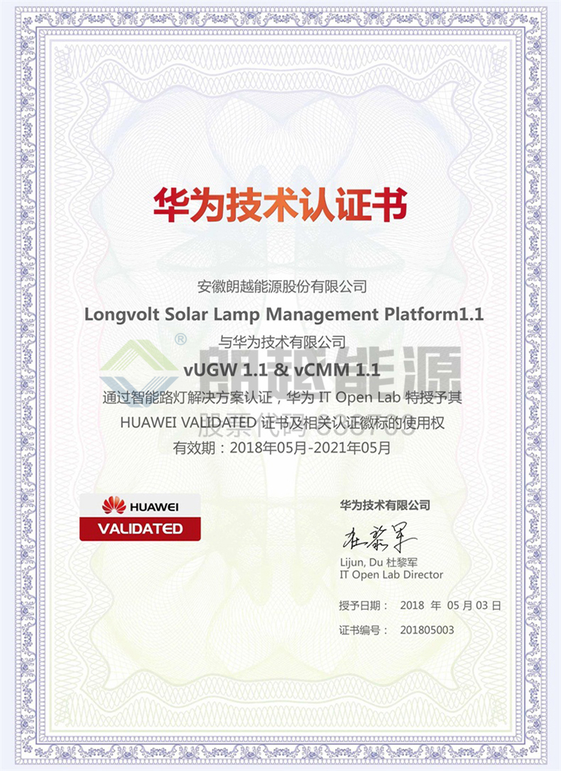 2018年5月3日,朗越能源與華為技術(shù)有限公司通過(guò)智能路燈解決方案認(rèn)證。