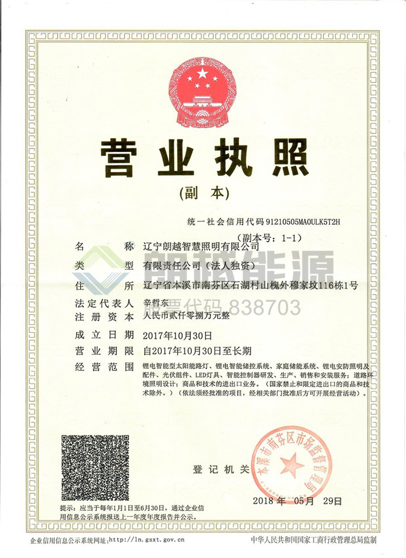 2018年5月29日,朗越能源全資子公司遼寧朗越智慧照明有限公司新增注冊(cè)資本,換發(fā)新版營(yíng)業(yè)執(zhí)照。