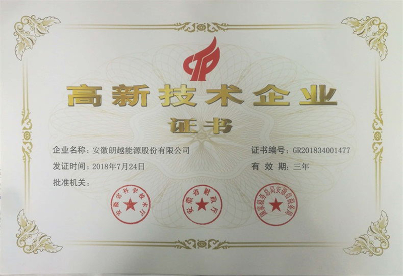 2018年7月24日,朗越能源再次榮獲高新技術(shù)企業(yè)證書。