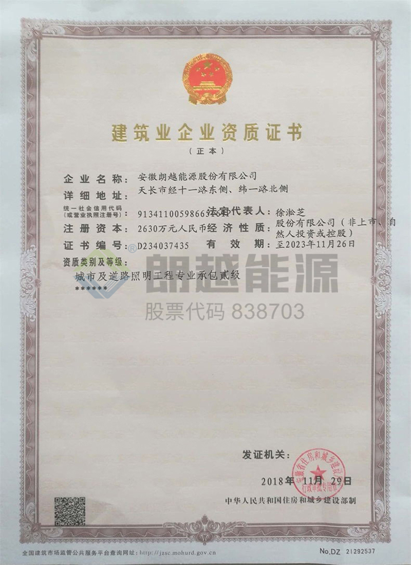 2018年11月29日,朗越能源升級(jí)建筑業(yè)企業(yè)資質(zhì)證書(城市及道路照明工程專業(yè)承包貳級(jí))。